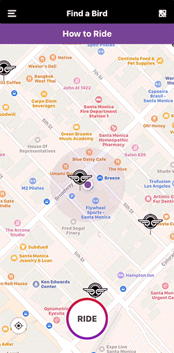 Finding a Bird takes a little bit of strategy but identifying Birds is not difficult. Bird scooters look like this and will also chirp to help Bird Chargers find them: